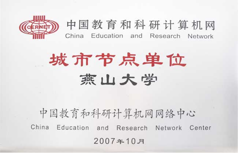 2007年,在CERNET的大力支持下,经我校积极筹建,中国教育和科研计算机网(CERNET)秦皇岛地区节点在我校建成。