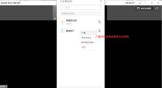 在与会者界面进行会控,进行声音控制、主持人控制,广播画面的控制;