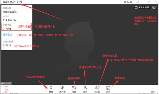 第三步:发起会议之后,会议界面如图所示;可将会议ID,参会密码,或者会议二维码发给参会者;
