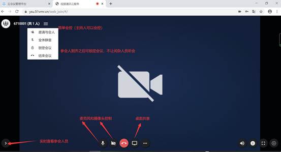 2)在参会者身份进入之后,没有会控操作,仅可查看参会人员以及本地的麦克风和摄像头等基本操作;