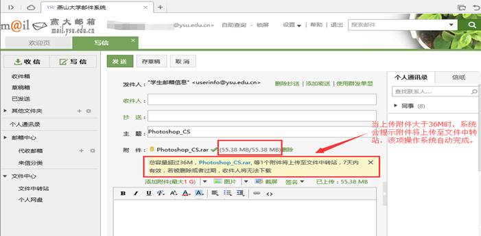 为了提升我校邮箱系统的服务能力,满足广大用户对邮箱容量的需求,我中心在整合现有存储资源的基础上,对教师和校属各单位使用的教师邮箱用户的存储空间进行扩容,并提供大附件邮件和个人网盘服务。各单位、各部门、全体教师校内邮箱的存储空间由原来的1G扩大至3G,并提供1G的文件中转站及3G的个人网盘。