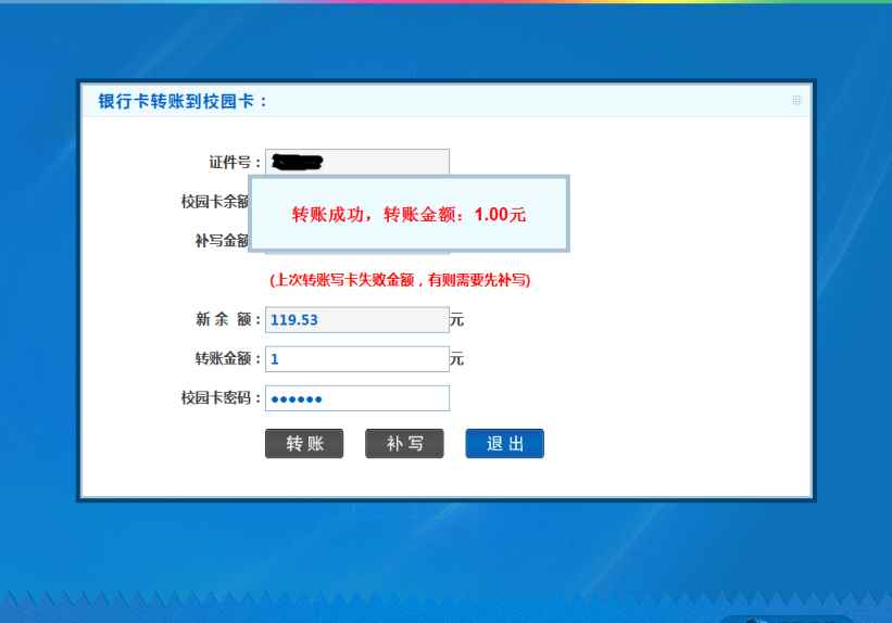 操作步骤:点击“银校转账”--- 在“转账金额”一栏输入金额 --- 输入校园卡密码 --- 点击“确定”,等待“嘀”的一声,系统会提示“转账成功”,如下图所示: