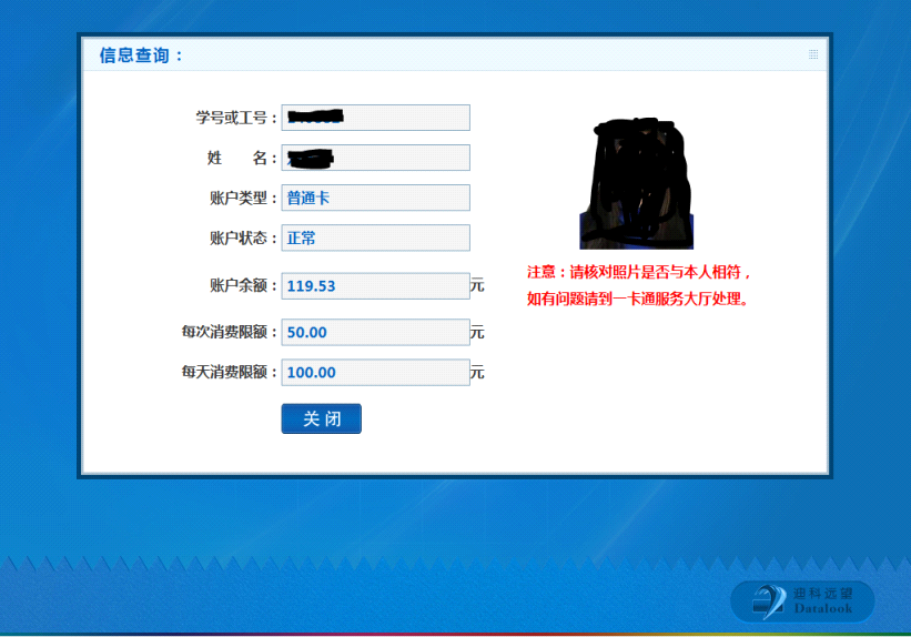 把校园卡放入自助终端感应区内,点击“信息查询”按钮,可以看到本人校园卡的相关信息。