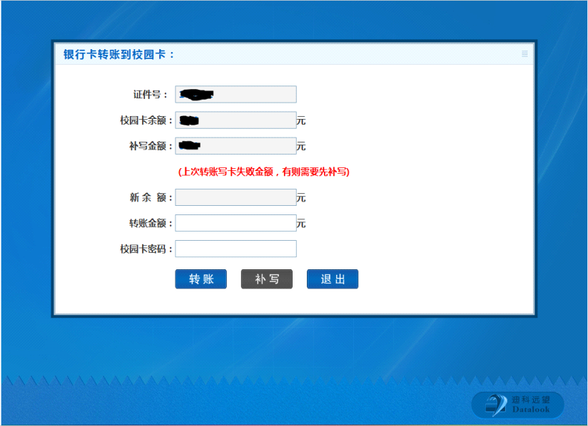 答:转账异常时,请到任意自助终端,进入银校转账页面,查看“补写”按钮是否被点亮,若被点亮,输入校园卡密码,点击“补写”即可。若无法补写,需本人携带校园卡和身份证或学生证到校园卡服务大厅处理。