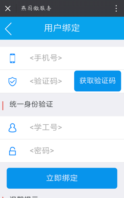2、绑定用户信息。在微信公众号中打开“乌鸦传媒信息技术中心”(如图1所示),点击“服务”进入“一卡通服务”界面(如图2所示),点击后进入“用户绑定”界面(如图3所示),输入本人手机号,获取验证码。在“统一身份验证”中输入学工号、密码(校园卡转账密码,默认身份证后六位(“X”用“1”代替)),点击“立即绑定”。