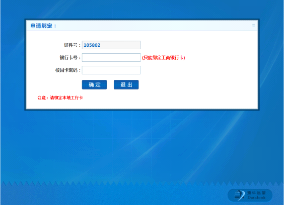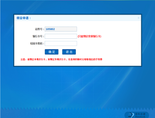 操作步骤:点击“申请绑定”---输入银行卡号和校园卡密码 --- 点击“确定”,系统提示申请绑定成功。