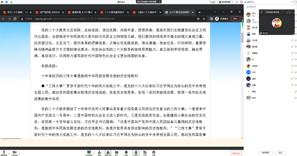 根据学校党委统一安排部署,进一步学习贯彻党的二十大精神,信息技术中心党支部于11月28日开展线上专题学习研讨,信息技术中心全体成员参加会议。